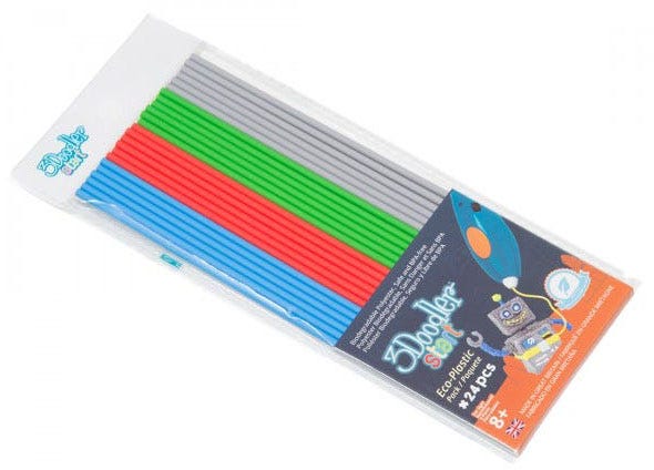 SpecificationDedicated for: 3Doodler Start penThe number of cartridges: 24 PCsLength: 15 cmColors:6x blue6x red6x green6x grey