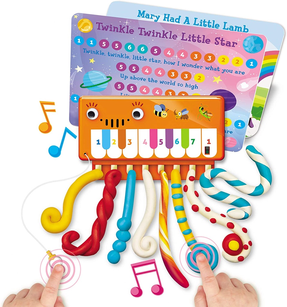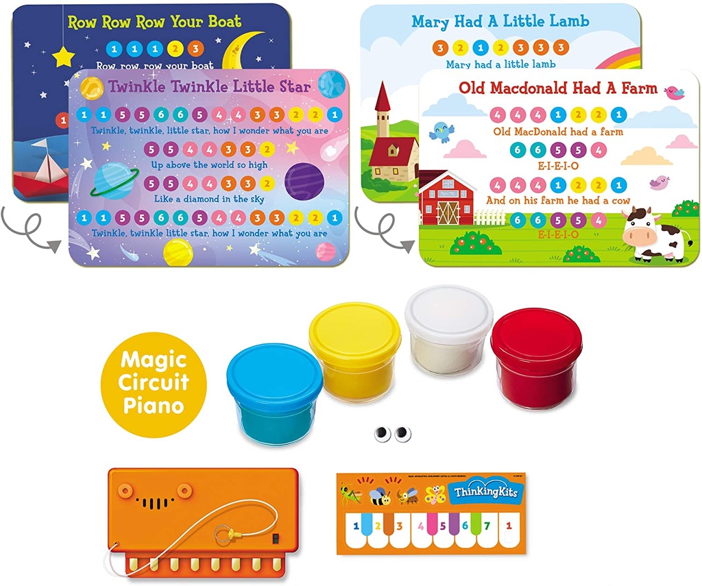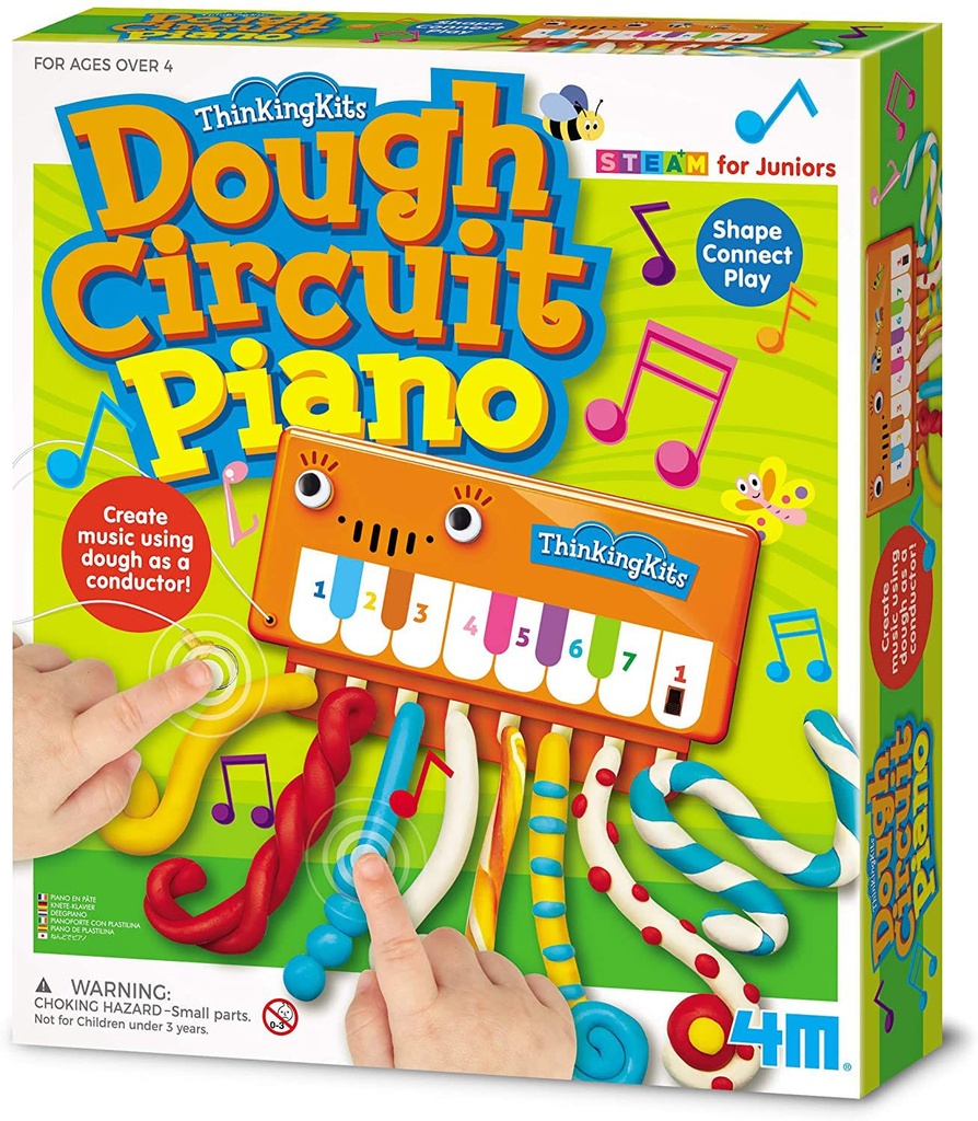 Create music and crazy designs with the 4M Dough Circuit Piano STEAM ThinkingKits.Attach the dough strips to the 8 pins on the piano module.Touch the ground pin and the strips to create a unique sou