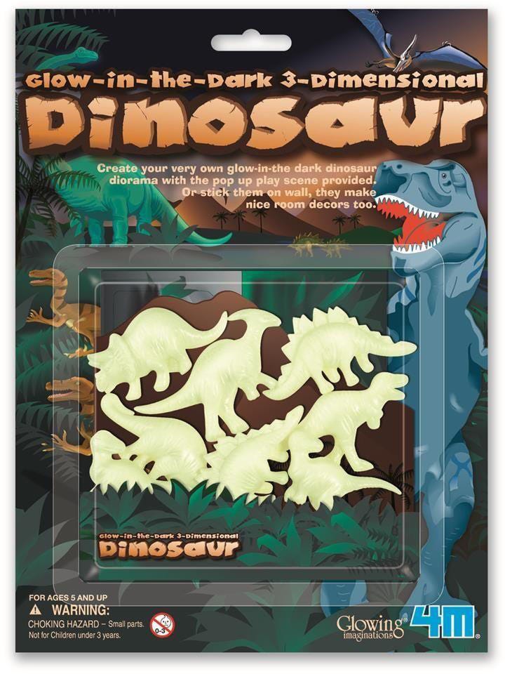 Decorate ceilings and walls or build dioramas with these glow-in-the-dark dinosaurs.This set includes double sided tape to easily affix the dinosaurs to any hard surface.Activate and recharge the glow by exposing the dinosaur pieces to light.Turn off the lights and watch these dinosaurs glow-in-the-darkness.