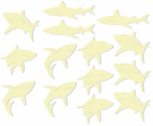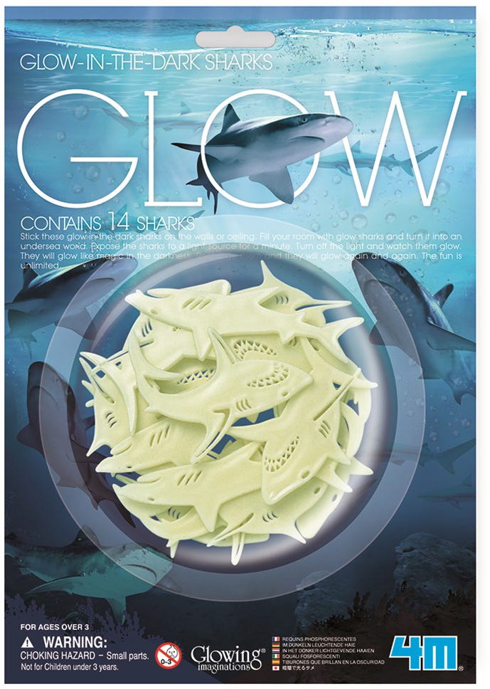 Stick these glow-in-the-dark sharks onthewalls or ceiling.Fill your room with glow sharks and turn it into an undersea world.Expose the sharks to a light source for a minute.Turn off the light and watch them glow.
