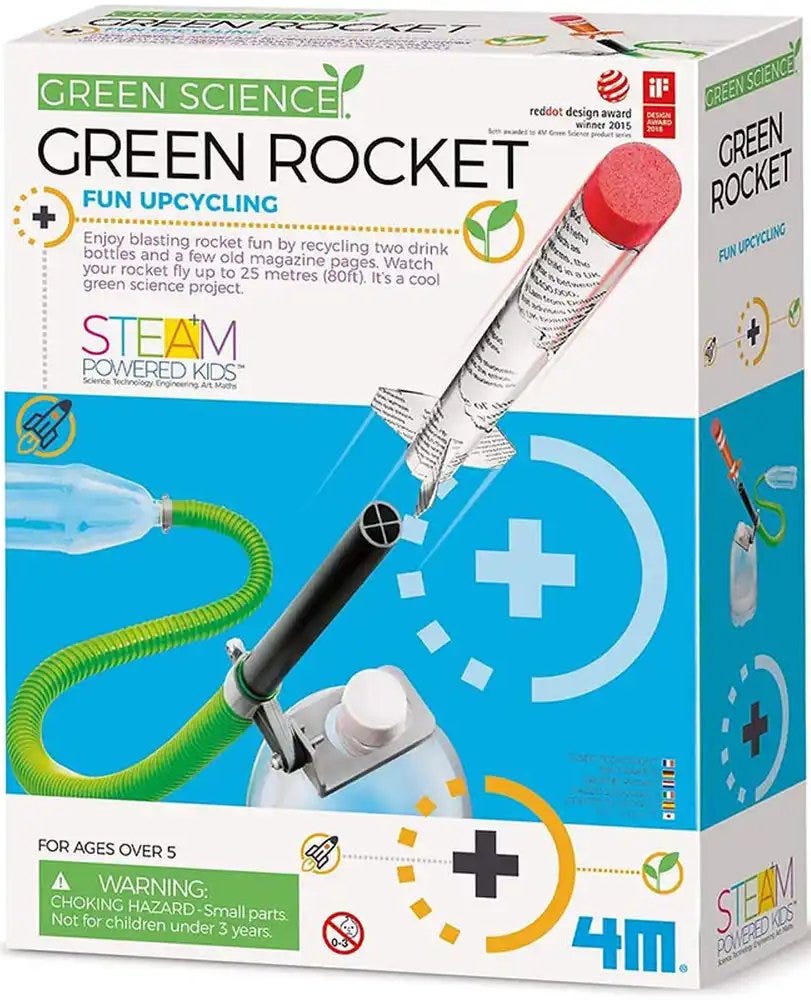 4M Kidz Labs Green Science Green Rocket,Learn about Green Energy and make your own Rocket with this amazing set from Great Gizmos! Made from trash and powered by green energy, this is the perfect way of teaching children about recycling and green energy.Simply add a recycled magazine and 2 recycled plastic bottle to what’s in the box and blast a paper rocket up to 25 metres into the sky! Amaze your friends with some green science.All it takes to complete this set is two drinks bottles and an old magazine.Watch your rocket fly up to 80 foot up in the air.Learn the underlying physics with this cool green science project.Made by respected Toy Manufacturers Great Gizmos.