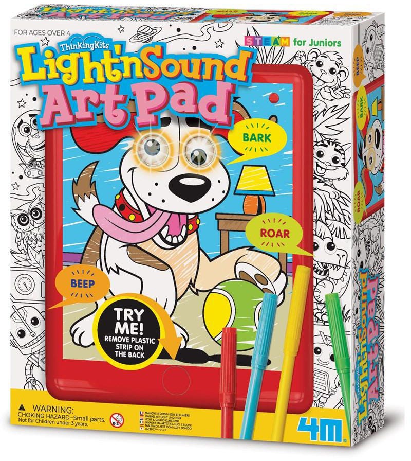 Cool characters come to life with the 4M Light 'n Sound Art Pad STEAM ThinkingKits.Color the characters using the 4 colored pens.Press the button on the pad to hear character-related sound effects.Packaging dimensions are 23.5 cm wide, 27.5 cm high and 5.5 cm deep