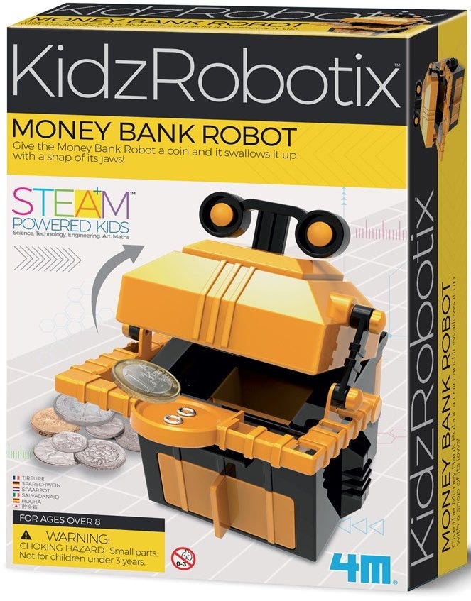 Excellent automatic money bank robot - you can place a coin on my arm and watch me eat your money! Kids love putting their pocket money into their very own bank! Contains 1 set plastic bank part, motor, wires, 10 screws, terminal caps, gears and detailed instructions.Required but not included in the kit: a small crosshead screwdriver and 1 x AA battery.The height is approximately 14cm when assembled.For Ages 8yrs+.