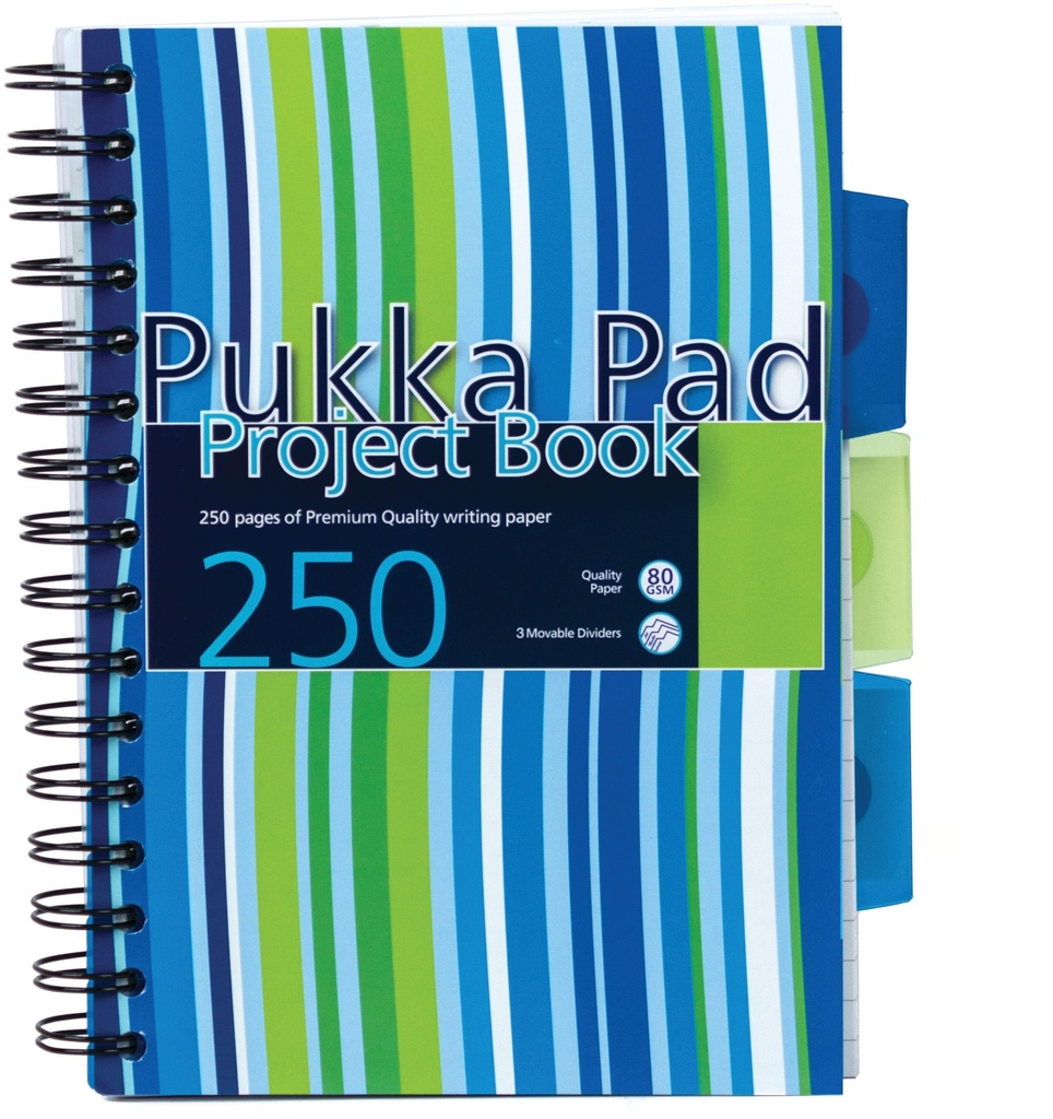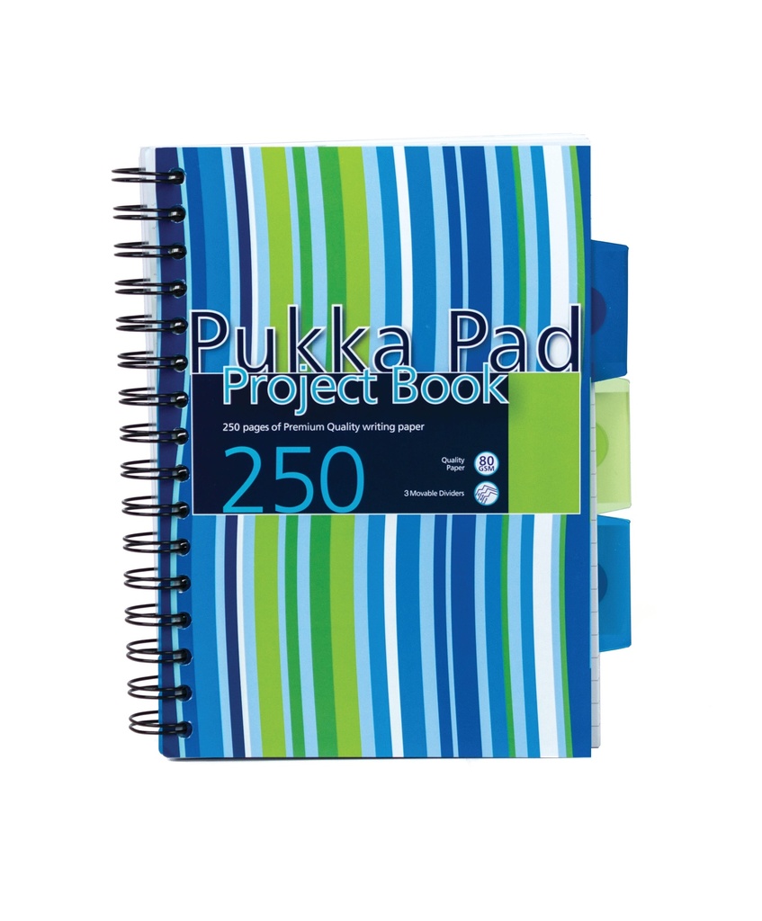This handy Pukka project book contains 250 pages of quality 80gsm paper and features removable dividers for organisation of your notes.The white pages are feint ruled for neat note-taking and perforated for easy removal.The durable notebook has polypropylene covers and wire binding, allowing it to lie flat for easy note-taking.This pack contains 3 x A5 project books.