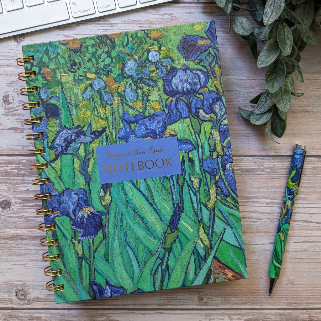 Feel inspired to journal your ideas with this charming spiral bound notebook featuring the iconic Irises artwork by Van Gogh.This versatile and stylish notebook will keep your notes in one place and