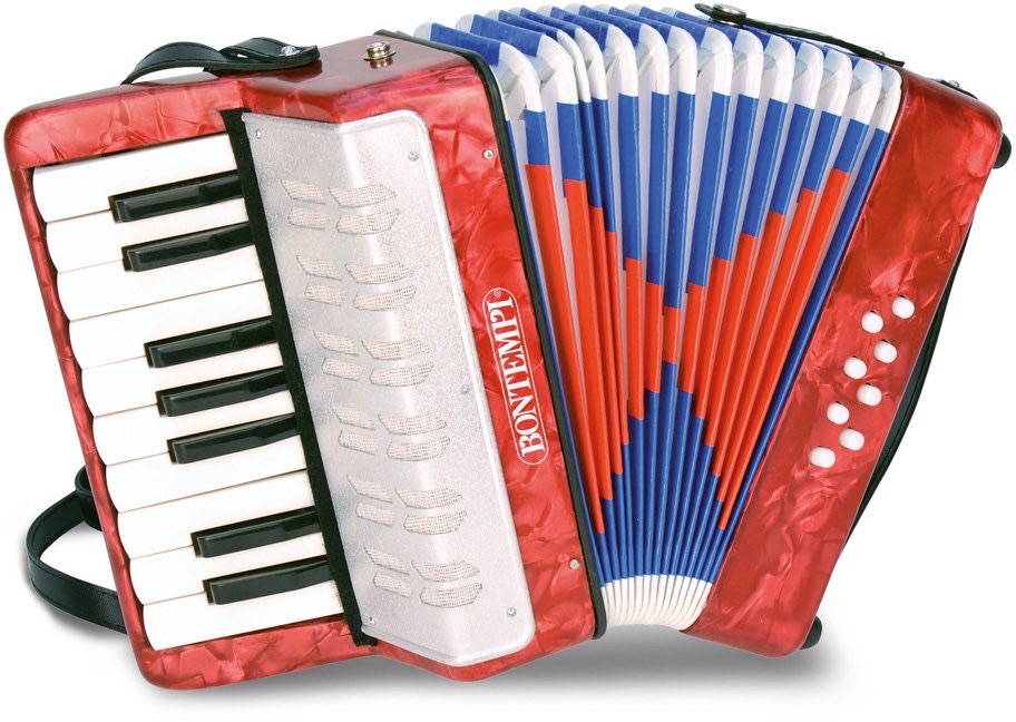 Accordion with 17 keys (C-E) including sharps and 8 bass buttons ï Metal reeds ï Sound quality same as on a real accordion ï Shoulder strap included ï Dim.235x120x250 mm.