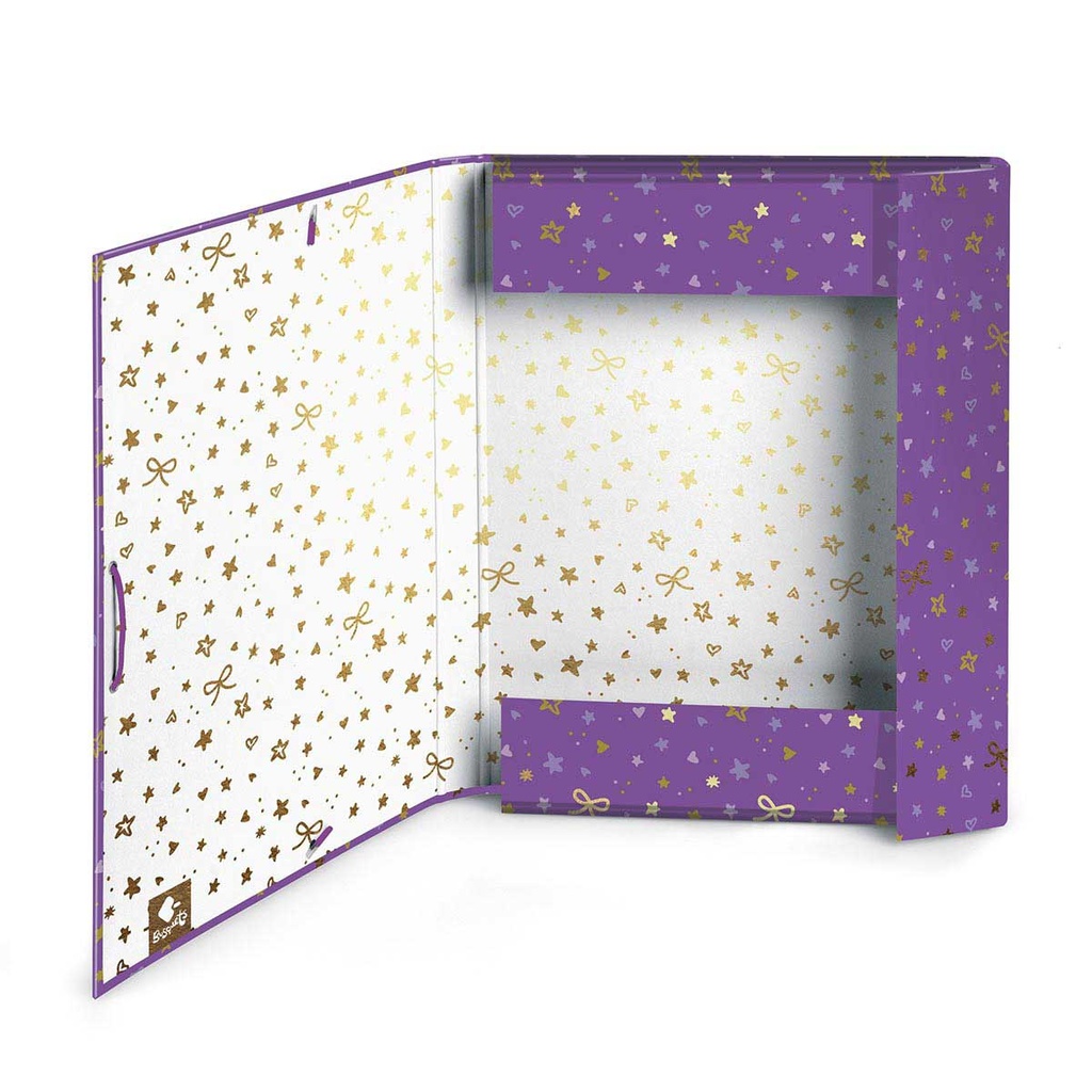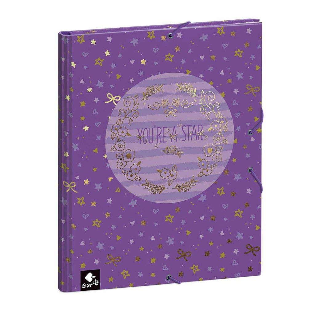 STAR document folder is decorated with a mauve background print with a more intense mauve stripes and hearts pattern and gold stars. In the center a golden floral print with the phrase YOU'RE A ST