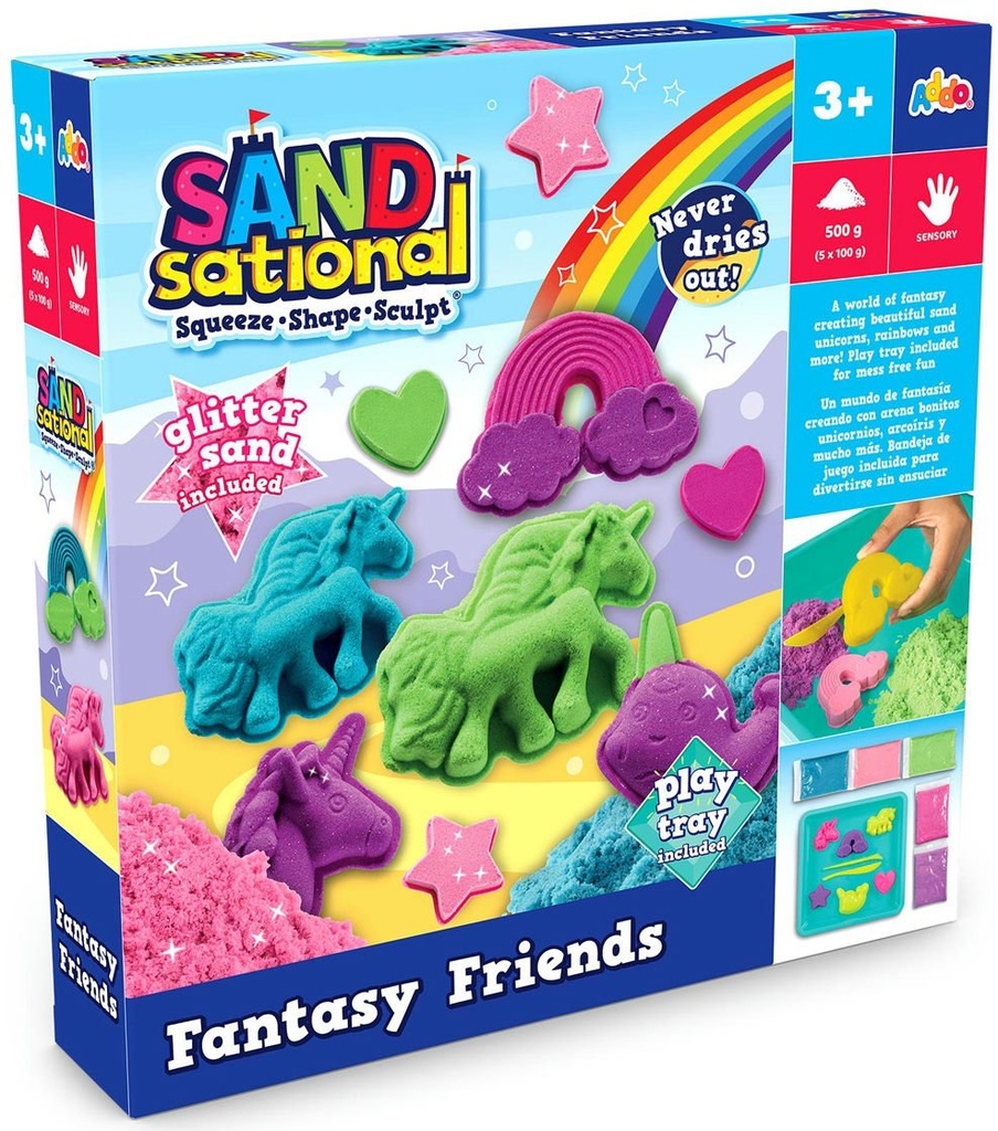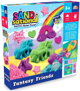 Dive into a magical world with the SANDsational Fantasy Friends playset! Squeeze, shape, and sculpt 500g of bright, never-drying sand to create enchanting mermaids, glittering rainbows, mysterious unicorns, and charming sea friends.This set includes fantasy-themed moulds, tools, and a play tray for mess-free fun.Perfect for inspiring creativity and sensory play, kids will enjoy hours of imaginative crafting.