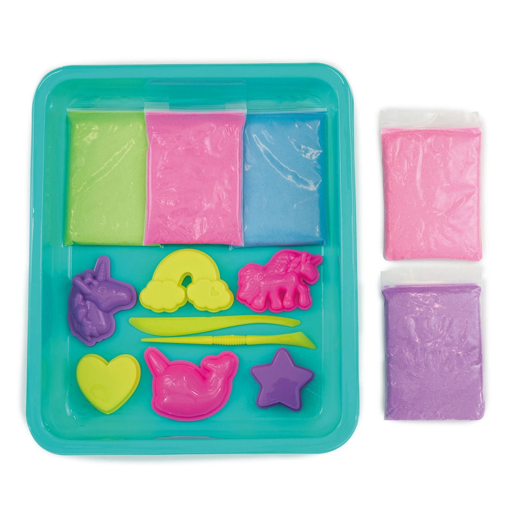 Dive into a magical world with the SANDsational Fantasy Friends playset! Squeeze, shape, and sculpt 500g of bright, never-drying sand to create enchanting mermaids, glittering rainbows, mysterious uni