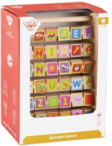This lovely wooden alphabet frame helps children with letter recognition.Each block comes with both the alphabetic letter, number, and illustration.The spinning blocks encourages children to play, explore and learn.Kids love flipping the blocks around.The frame is smooth and well made.Paint used are non- toxic.