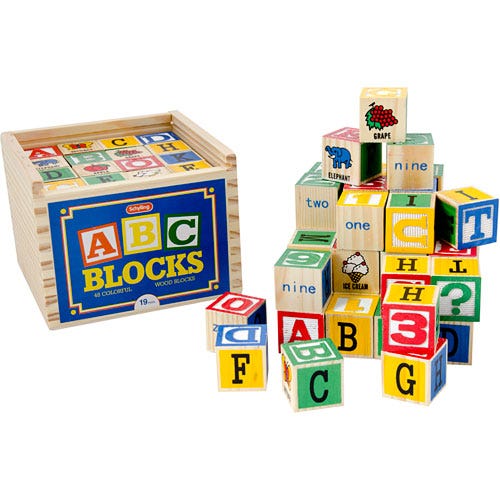 This is the big one.A true Preschool classic from Schylling Toys, the world leader in traditional toys and classic fun.The Big Blocks ABC Alphabet Blocks are 48 1.75-inch solid wood cubes painted and sculpted with letters.It's hours of fun building, creating, and "writing." Regular playtime with them can improve letter identification skills, and illustrate how placing one letter next to another and another can make a word.On two sides of each block the letters are slightly raised and painted in cheerful red, blue, green, or yellow, with a border for emphasis.It is packaged in a beautiful, dove-tail constructed wooden box with a clear slide off lid.This a playroom heirloom destined to be passed down from generation to generation.For ages 19 months+.