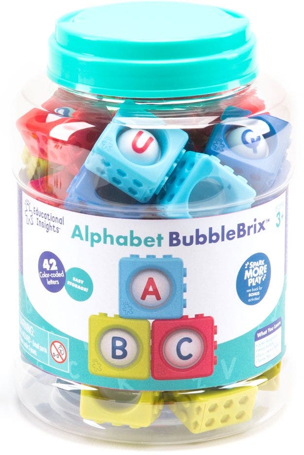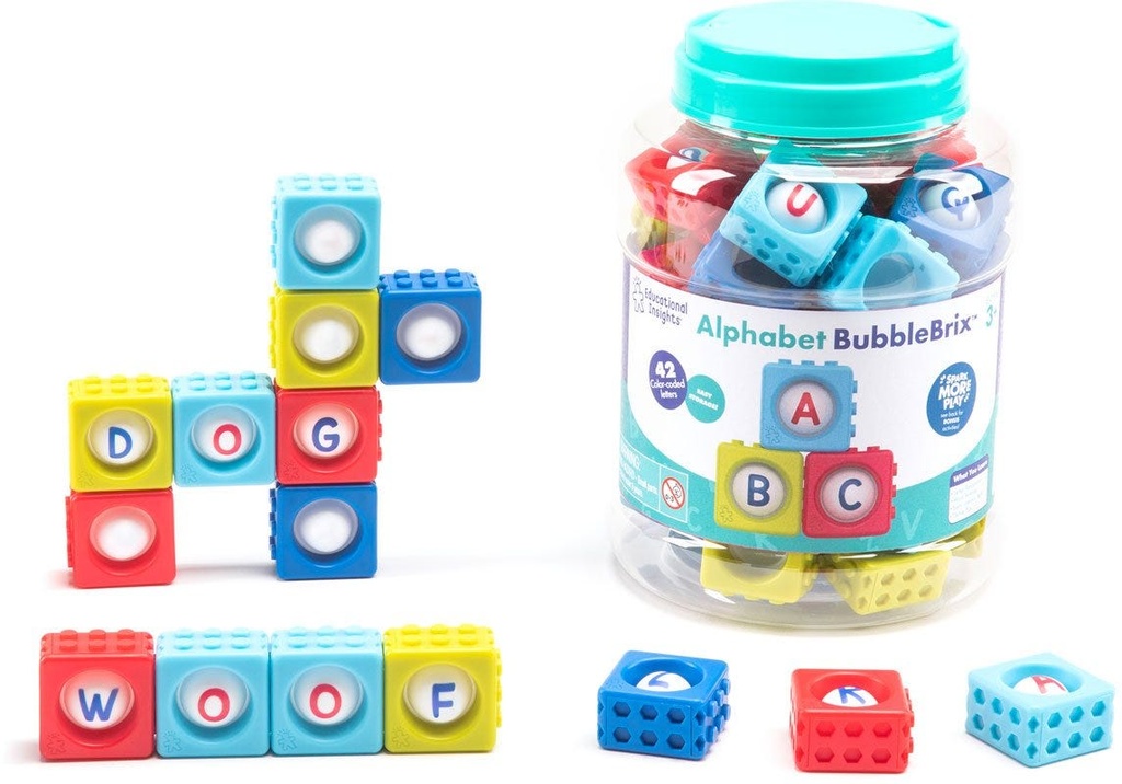 Children can have fun while learning with Alphabet BubbleBrix! This unique educational toy allows kids to press a letter block, hear and feel it pop, and practice identifying its name and sound.They