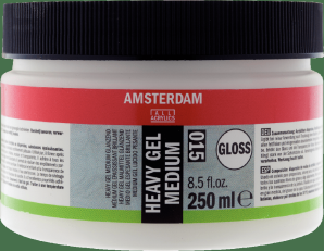 If you’re looking for some extra volume and dimension, try mixing your acrylic colors with one of the Amsterdam gel mediums.These mediums offer a sharper, pastier texture and give your work, depending on the selected gel, a glossier or more matt finish.Adding more of this medium will result in higher transparency of the color.Due to their adhesive properties, these gels also work well for different mixed media techniques.Amsterdam gel mediumAvailable in gel, heavy gel and extra heavy gel versions in both matt and glossy finishesMakes acrylic paint thickerAllows application of extremely thick layers of acrylic color in one strokeAlso suitable for mixed media techniquesMilky white when wet, dries colorless and transparentWaterproof when dryClean utensils with waterApply at temperatures above 10° C and store free of frost