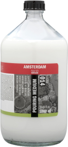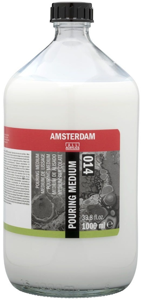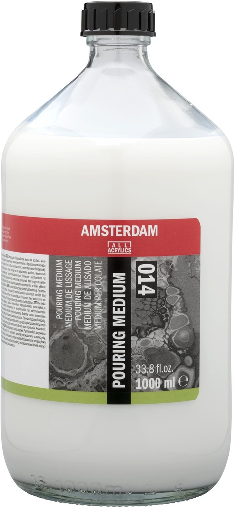 Change the flow of your Amsterdam Standard and Expert Series acrylics or acrylic ink by adding Amsterdam pouring medium.This medium is specifically developed to be self-leveling and increases the flexibility of the paint film to prevent cracking.Depending on the desired flow, you can adjust the mixing ratio to your liking.Amsterdam pouring mediumMilky white when wet, dries colorless and transparentShake well before useAffects the degree of glossSelf-levelingDoes not affect the drying time of the paintIncreases the flexibility of the paint filmCan be thinned with a small amount of waterWaterproof when dryClean utensils with waterApply at temperatures above 10° C and store free of frost
