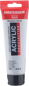 Amsterdam Standard Series acrylic paint in Pearl Blue (820) is a transparent color with an excellent lightfastness ( and ). Amsterdam Standard SeriesOur Standard Series offers you the broadest range of remarkably vibrant acrylic colors.This versatile paint is easy to work with and offers a smooth application.Use the paint straight from the tube or thinned with a little bit of water or one of our acrylic mediums.Medium viscosity paint for visible brush strokes, texture and smooth coverage with a satin finishMade with high-quality, lightfast pigmentsFormulated with 100% acrylic resin binder, resulting in an exceptionally durable and flexible paint film with a uniform degree of glossOdorless, water-based formula that becomes waterproof and permanent when dryExtensive range of 90 colors with a great variety in opacity, including 17 Specialty Colors (metallic, pearl and reflex finishes)Adheres to virtually any slightly porous surface, including canvas, paper, cardboard, wood, stone and cementProudly crafted in the Netherlands