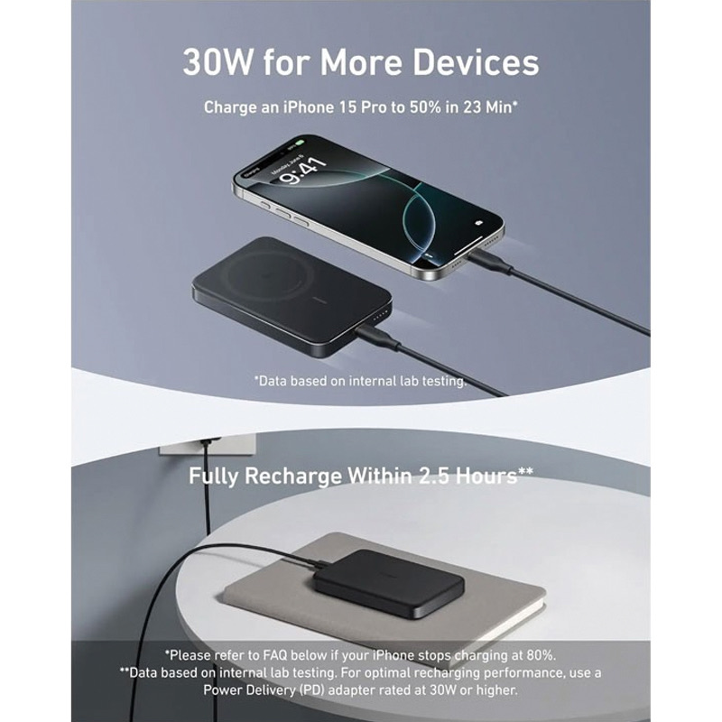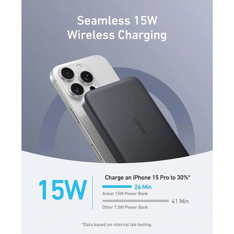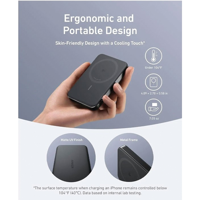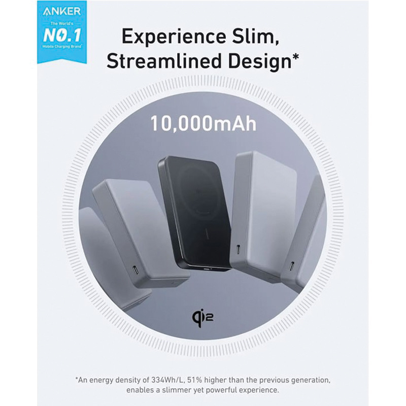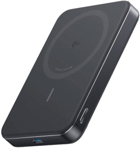 Slimmest Power YetAt just 0.58 × 2.78 × 4.09 inches thick, achieve maximum portability and power with our slimmest design to date.(Note: Based on internal comparisons with previous Anker models.)Ultra-Fast 15W Wireless ChargingKeep your devices fully charged wherever you go with 15W Qi2-certified wireless output, which charges an iPhone 15 Pro from 0 to 50% in 51 minutes.It also features a 30W USB-C port for extensive compatibility.Ergonomic Design, Enhanced PortabilityCombines a matte UV finish and a sturdy metal frame for a superior user experience, enhanced by aerogel thermal insulation to keep it cool to the touch.10,000mAh High-Capacity PowerIdeal for both daily use and travel, this power bank offers ample capacity, providing 1.8 full charges for an iPhone 15 Pro.What You GetAnker MagGo Power Bank (10K, Slim), 23.62" / 60 cm USB-C to USB-C cable, welcome guide, 24-month warranty, and our friendly customer service.