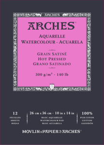 Ideal for watercolor painting, as well as all wet techniques such as ink, gouache, and acrylic.3 textures: cold-pressed, hot-pressed, and rough.ARCHES® Aquarelle has an even, natural grain.The choice of texture will depend on the medium used by the artist.As a general rule, though, texture is a matter of personal choice for the artist, part of the process of artistic creation and expression.