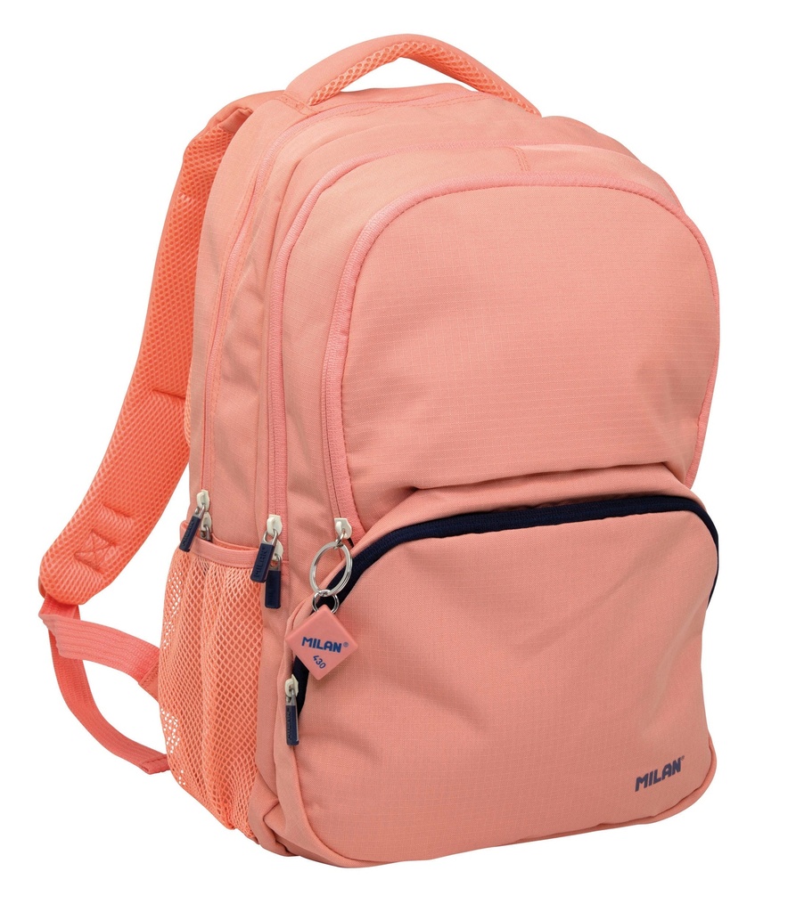 School backpack with 4 zips.1918 series, pink colour.Inspired by the original colors and design of MILAN erasers, manufactured in Spain since 1918.Main compartment with a protective laptop sleeve.3 front compartments.2 quick-access mesh side pockets.Adjustable straps, padded and breathable back, reinforced base and trolley sleeve.The front pocket includes a 430 eraser key ring on the zipper handle.Navy blue inner lining printed with a grid that evokes the shape of MILAN erasers.'Ripstop' outer fabric: light and resistant to riping and tearing.It uses a special technique that weaves thick, reinforcement threads at regular intervals creating a crosspatch pattern.Fabric composition: polyester outer fabric and inner lining.Dimensions: 46.5 x 30 x 17 cm.Capacity: 25 litres.