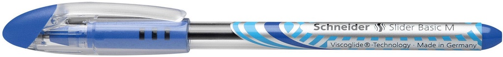 Ballpoint pen with Viscoglide® technology for extraordinarily smooth, gliding writing.Writing colour blue.Medium line width (M).The ink dries quickly - even on smooth paper - and is smudge proof when highlighting it later on.Slimline design with an attractively decorated transparent barrel and clip cap that fits neatly on either end of pen.The rubberised grip zone provides a secure hold for relaxed writing.The wear-resistant stainless steel tip guarantees that the large ink supply can be fully used and does not smear.The Slider Basic is produced CO2 neutral.