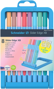 Ballpoint pen with Viscoglide® technology for extraordinarily smooth and gliding writing.Box with 8 pieces in pastelic colours: flamingo, mint, peach, lilac, rose, baby blue, ocean and blush.Extra broad line width (XB).The ink dries quickly - even on smooth paper - and is smudge proof when highlighting it later on.The black ink is waterproof according to ink standard ISO 12757-2.Ideally suited to drawing and painting projects because the special ink will not run even on absorbent paper.A generously rubberised three-sided barrel is designed for relaxed writing without hand fatigue.It does not roll on the desk and its slim shape fits perfectly into school children's pencil cases or into desk pen drawers.The cap fits neatly on either end of pen.The wear-resistant stainless steel tip guarantees that the large ink supply can be fully used and does not smear.The convenient adjustable pencil case is durable, can be used as case penholder and is also made of waste from internal plastics processing.The Slider Edge is produced CO2 neutral.