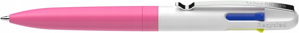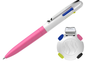 Four-color ballpoint pen with refills: black, blue, neon yellow, and neon pink.The barrel color is white/pink.The Take 4 refill offers the perfect solution for planning and organizing your work.Use