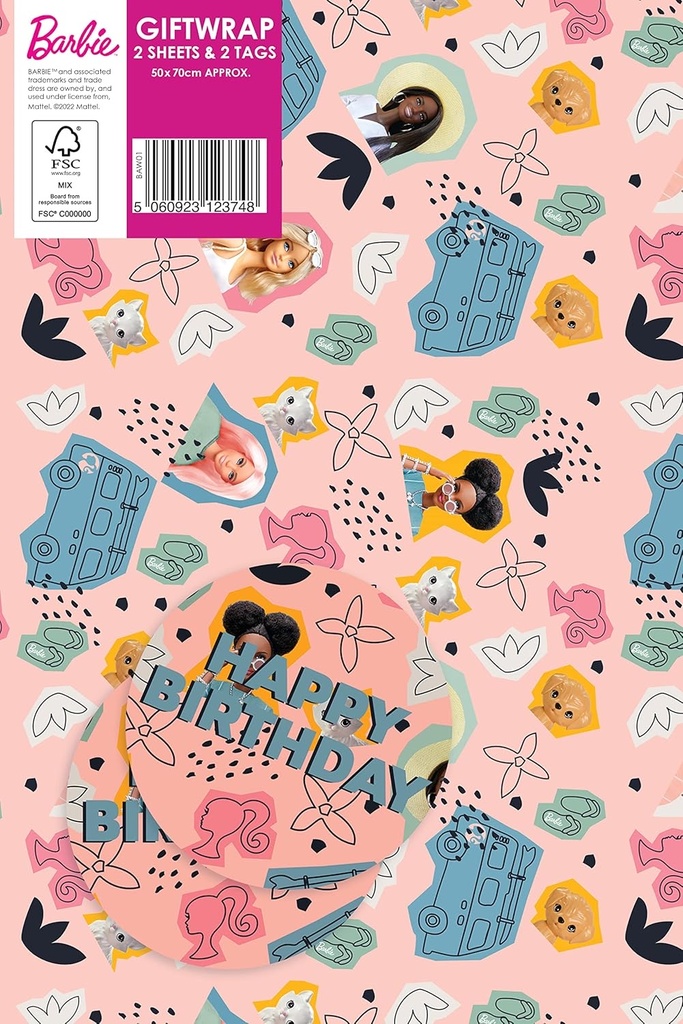 Wrap your gifts in style with this officially licensed Barbie gift wrap pack! It includes 2 sheets of vibrant, colorful gift wrap featuring Barbie themed artwork, as well as 2 pink Barbie gift tags with the text "Happy Birthday." This high-quality gift wrap is perfect for any occasion, whether it's a birthday party, a holiday celebration, or just because.