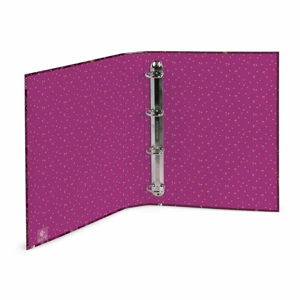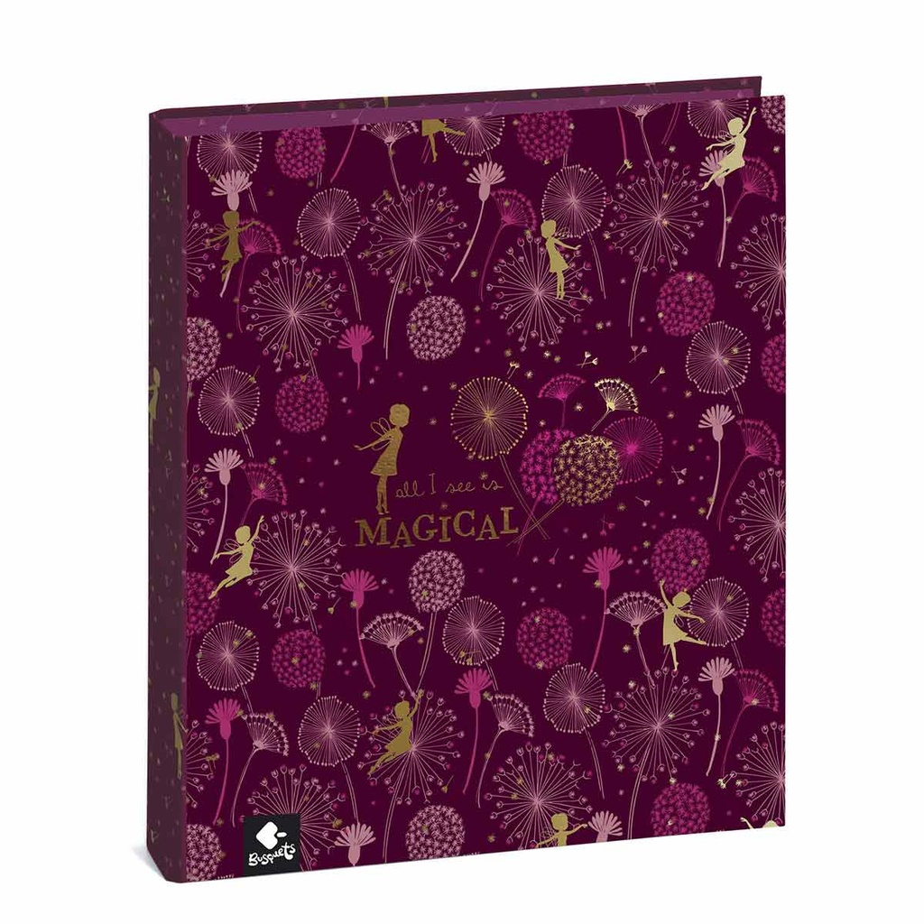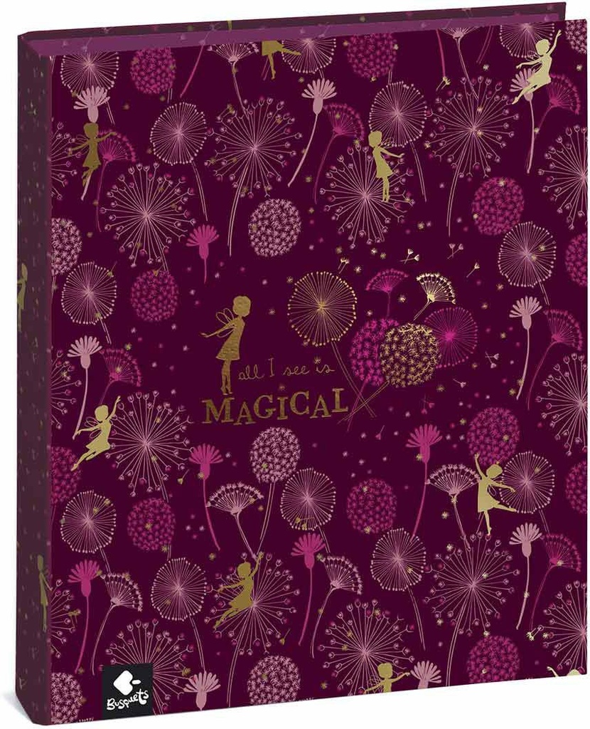 4-ring binder 3,5 MAGICAL is decorated with a burgundy print and a pattern made with seeds and nibs that disperse through the air when the full flower of desire blows of golden fairies in contrast and flowers in full dispersion. A fairy and Magical's motto stand out in gold. Interiors in pink.