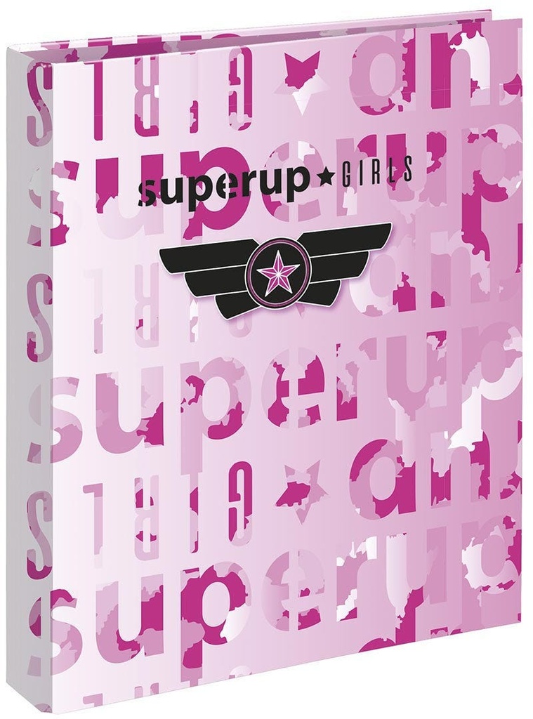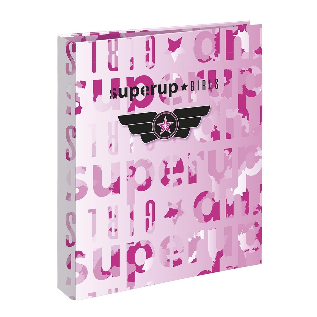 SUPERUP 4 ring binder is decorated with a military print in pink colors with the SUPERUP GIRLS logo in black and a military star and wings insignia. Pink zipper pulls and interiors. Interiors in the s