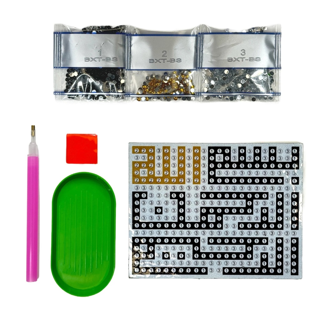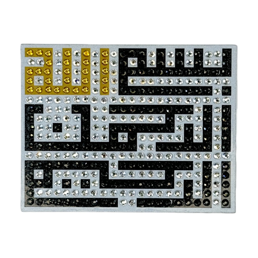 A diamond paint-by-numbers acrylic magnet kit with a calligraphy design that reads "Bismillah Ar-Rahman Ar-Rahim" (In the Name of God the Most Gracious Most Merciful) in Arabic.Use the applicator pen to apply the “diamonds”, one-by-one, on the adhesive numbered acrylic magnet.The end result is a shimmering work of art that can be used as a magnet on your refrigerator, memo board, locker, or other magnetic surface
