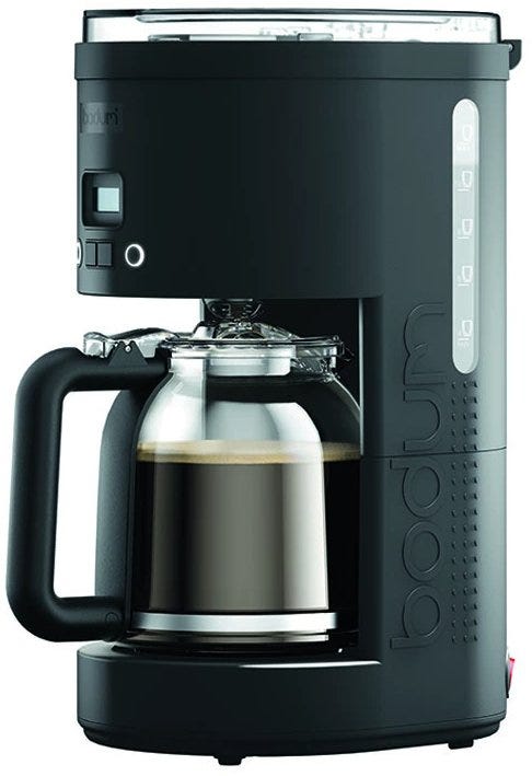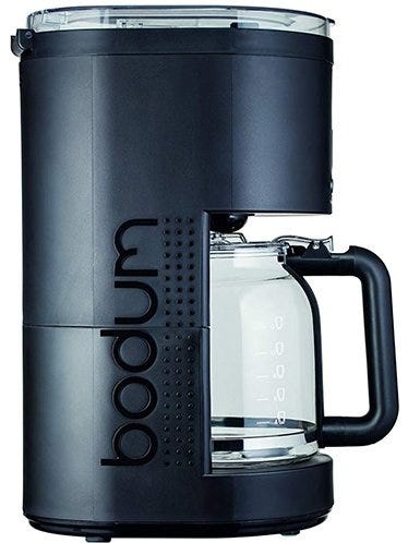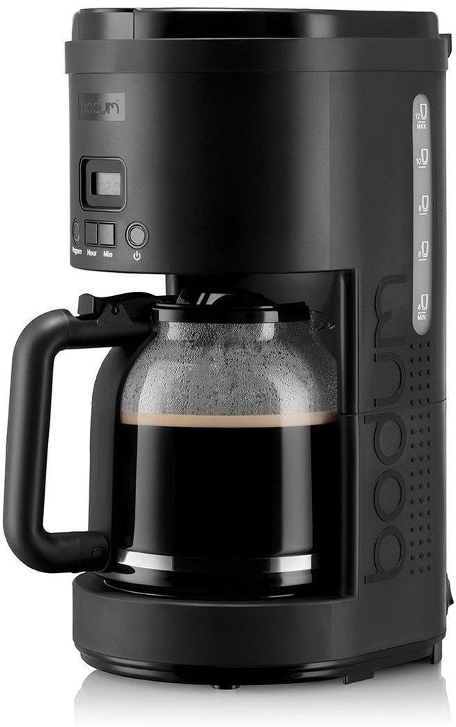 Glass jug with an ergonomic, non-slip handle for easy pouring.The brewing system uses a shower head that distributes water evenly over the beans for a balanced, flavorful taste.Permanent, fine-mesh, stainless steel filter that results in a full-bodied aroma and pure taste.Easy-to-read, backlit LED display.Generous 1.5-liter capacity that brews up to 12 cups of coffee.