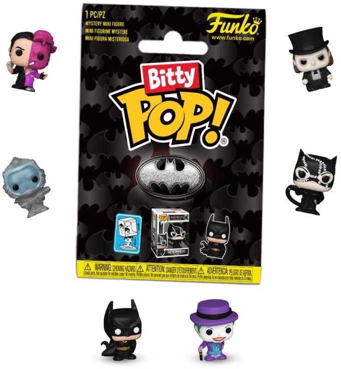 The world of POP! is getting bigger—and smaller—with Bitty POP! collectibles! Expand your DC collection with this assortment of Bitty POP! figures featuring some of your favorite heroes and villains! Each Bitty POP! comes in mystery packaging and includes one collectible figure.Who will you find? There’s Bitty POP! Batman™ - 1989 (1/8), Bitty POP! The Joker™ - Batman™ 1989 (1/8), Bitty POP! Catwoman™ - Batman™ Returns (1/8), Bitty POP! Selina Kyle™ - The Batman™ (1/16), Bitty POP! The Riddler™ - The Batman™ (1/16), Bitty POP! Batman™ - The Batman™ (1/16), Bitty POP! Mr.Freeze™ - Batman™ & Robin (3/32), Bitty POP! Batman™ - 1997 (1/32), Bitty POP! The Penguin™ - Batman™ Returns (3/32), Bitty POP! Two-Face™ - Batman Forever™ (3/32), Gold Bitty POP! Batman™ - Batman Forever™ (1/32), and Bitty POP! The Riddler™ - Batman Forever™ (3/32).Bitty POP! collectibles are packaged in hard acrylic cases with detachable bottom lids.Detachable bottom lids double as acrylic bases, to which the Bitty POP! figures are adhered.Vinyl figures are approximately 0.9 in (2.3 cm) tall.Warning: Choking Hazard.Collectibles are small.Not for children under the age of 3 years old.Item selection is random, as each piece is in blind packaging.We cannot accept requests for specific items.You may receive duplicate figures.