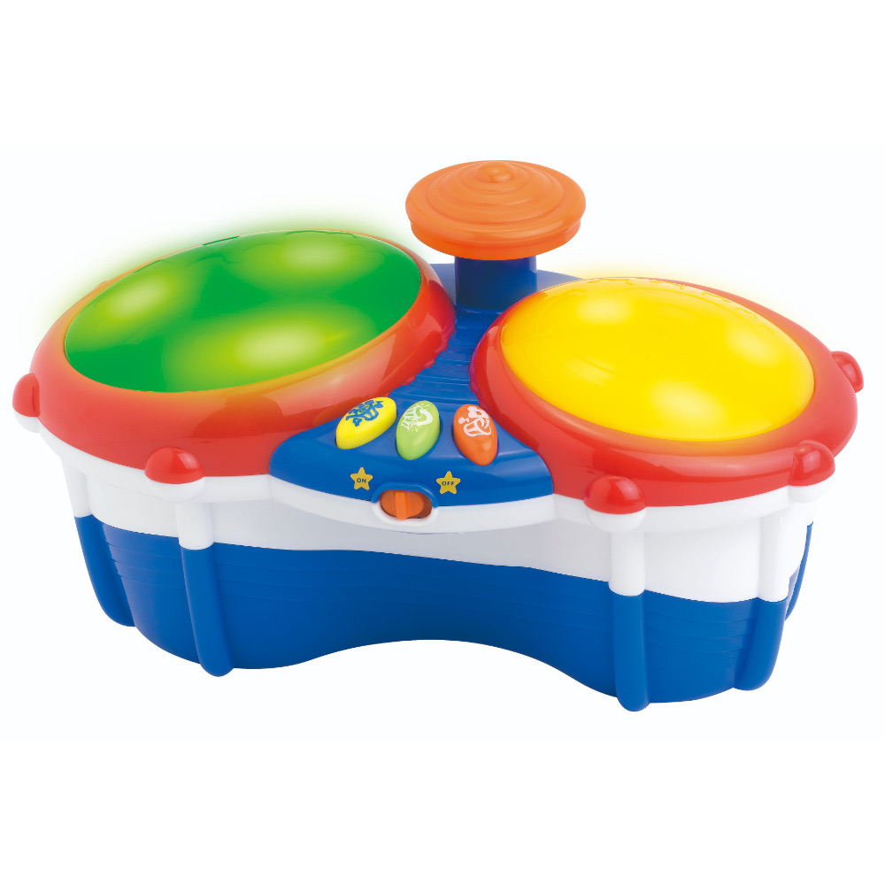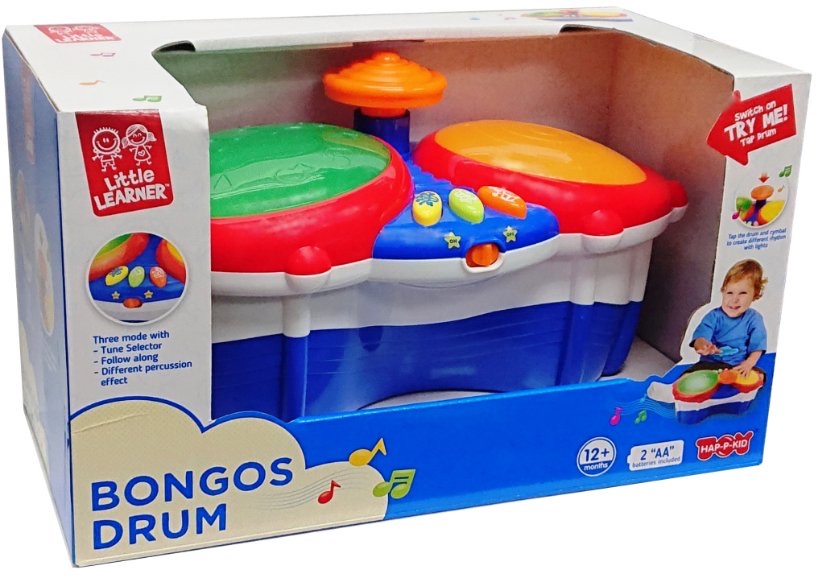 ntroducing the Little Learner My First Bongos Drum, an engaging and interactive musical toy designed for toddlers aged 12 months and up.This delightful bongo drum set features two drums and a cymbal that light up and play fun sounds when tapped, providing endless entertainment and encouraging musical exploration.
