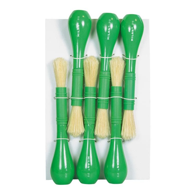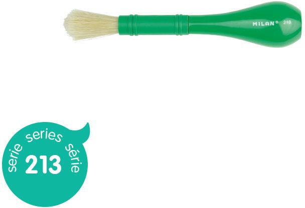 Round brush with short green plastic handle, ergonomic, easy to hold, specially designed for children from 3 years old.The base of the handle is flat and allows it to be placed in a vertical position.Composition: natural Chungking bristle hair.Suitable for glue, varnishes and tempera.Pile diameter: 13.4mm.Hair length: 37.5mm.Brush length: 155mm.