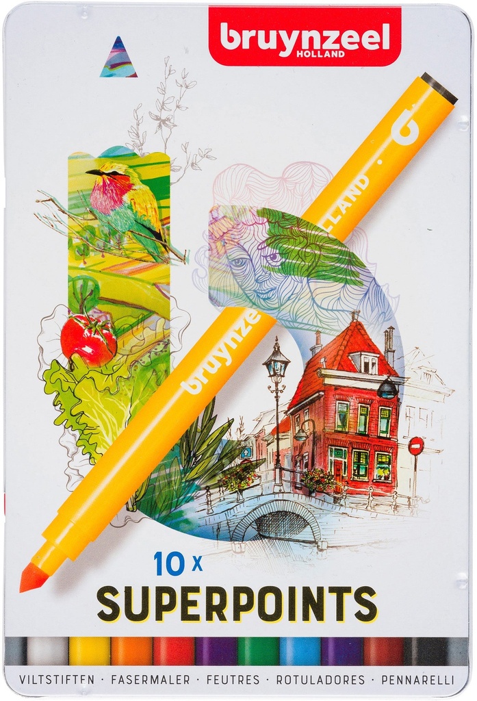 10 colours of the super point felt tips packed in a tin.Includes a white corrector pen.The Bruynzeel super point felt tips are perfect for creative adults to use for mandalas, bullet journalling and