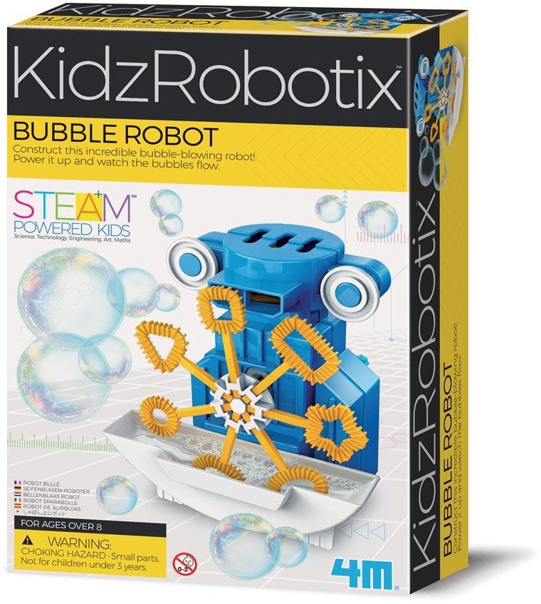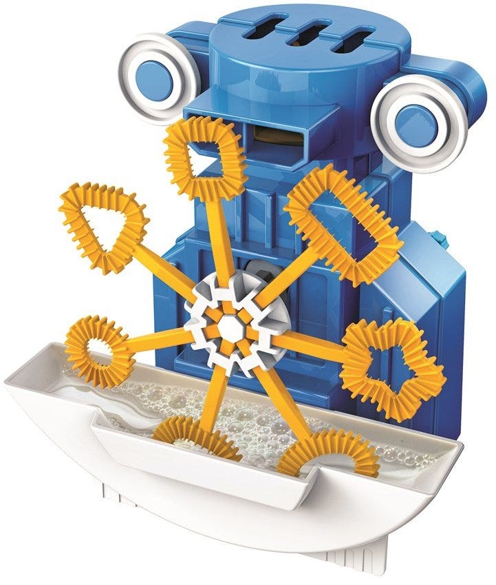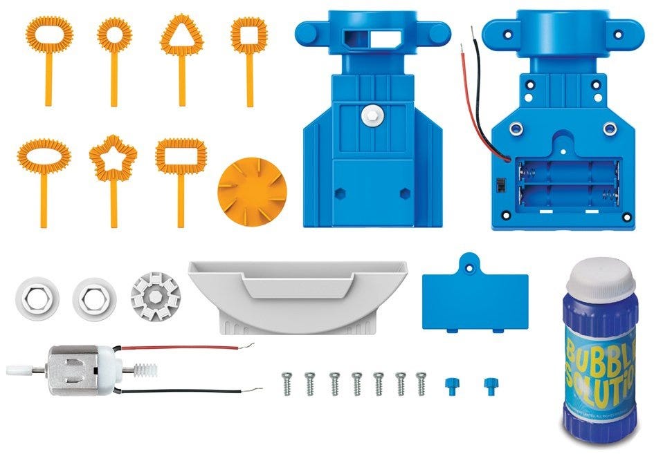 Non-stop bubble-blowing machine.Fill the tray with bubble solution and watch me blow bubbles! You can also remove the bubble wand to blow bubbles yourself! Contains 1 set plastic parts and accessories, bubble solution, motor, wires and detailed instructions.