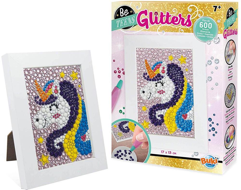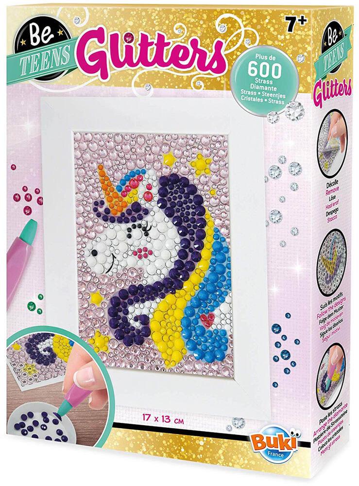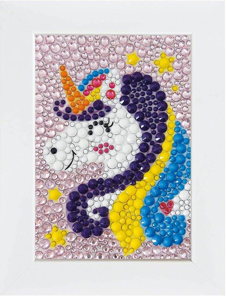 Stick the rhinestones onto the corresponding numbers, letters, or symbols to create a unique picture! A stylus with a specially designed wax tip makes it easy to pick up the rhinestones and place them on the picture's adhesive surface.Three different rhinestone diameters are included, in both shiny and matte finishes.Once the rhinestones are in place, the child can put the picture in a pretty white wooden frame! Picture dimensions: 10 x 14 cm.