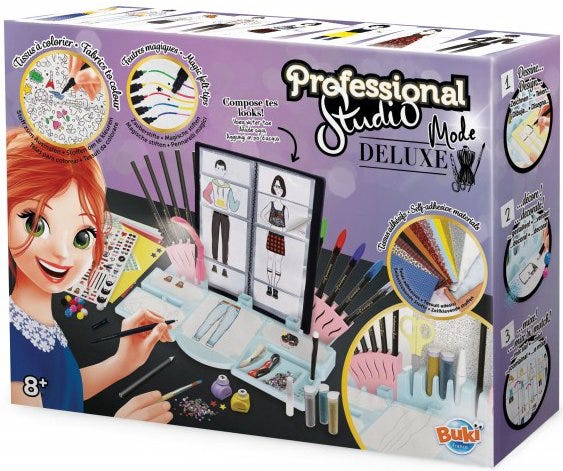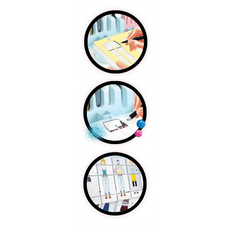 A design studio for you to create your own look book of ladies’ and men’s fashion! Switch the light on, put a stencil in and draw clothes on the figure outlines.Then decorate them with the self-adhes