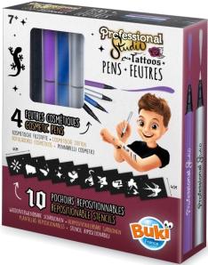 Cosmetic pens for drawing super colourful tattoos.Use the pen to draw freely or colour in the stencils.Cosmetic pens can be erased after a few days by washing or using make-up remover, depending on skin type.For children aged 7 and over only.WARNING! Not suitable for children under 36 months due to small parts which can be ingested.Choking hazard.RETAIN THE PACKAGING FOR FUTURE REFERENCE.The colors and content may slightly vary.Do not tattoo the face or any other sensitive area.WARNING! Do not apply around the eyes.