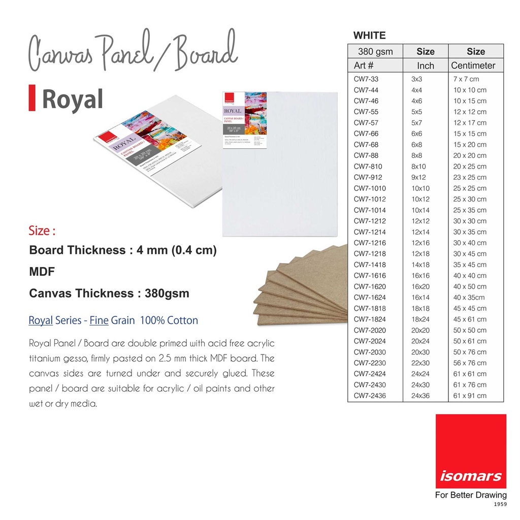 Royal Panel / Board are double primed with acid free acrylic titanium gesso, firmly pasted on 2.5 mm thick MDF board.The canvas sides are turned under and securely glued.These panel / board are suitable for acrylic / oil paints and other wet or dry media.
