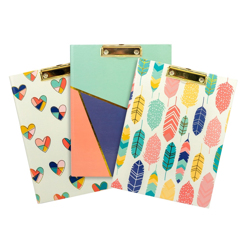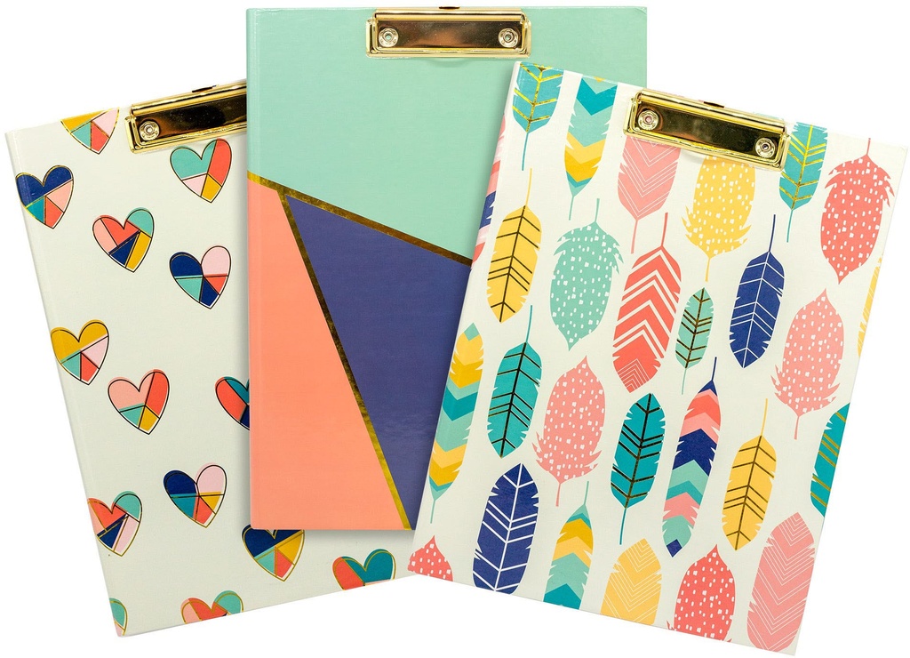 The padfolio is available in three fun designs: Hearts, Geometric, and Feathers in both singles and three packs.They’re a great way to bring some fun into your home or office.They’re ideal for A4 size papers.