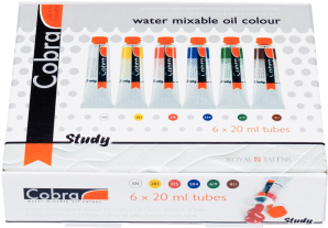 This convenient set contains six colours of Cobra Study oil paints in tubes of 20 ml.Contents: 6 x 20 ml (Titanium White 105 – Permanent Yellow Light 283 – Pyrrole Red 315 – Ultramarine 504 – Permanent Green Deep 619 – Burnt Sienna 411).About Cobra StudyCobra Study is a water-mixable oil paint that offers the same fantastic results as traditional oil paints, without having to use harmful solvents.Cobra Study is made with the same high-quality pigments, and yet, with Cobra Study you can paint at an affordable price.This is because we offer only a selected number of colours and use less pigments that are not as finely milled as those used in the Cobra Artist series.Can be mixed and cleaned with water.Created with high-quality pigments.Affordable alternative for the Cobra Artist series.Available in 40 semi-transparent, semi-opaque and opaque colours with the highest degree of lightfastness ( and ).Cobra can be used in conjunction with traditional oils and when mixed at a ratio of Cobra 4:1, the mixture will retain its ability to be thinned and cleaned with water.