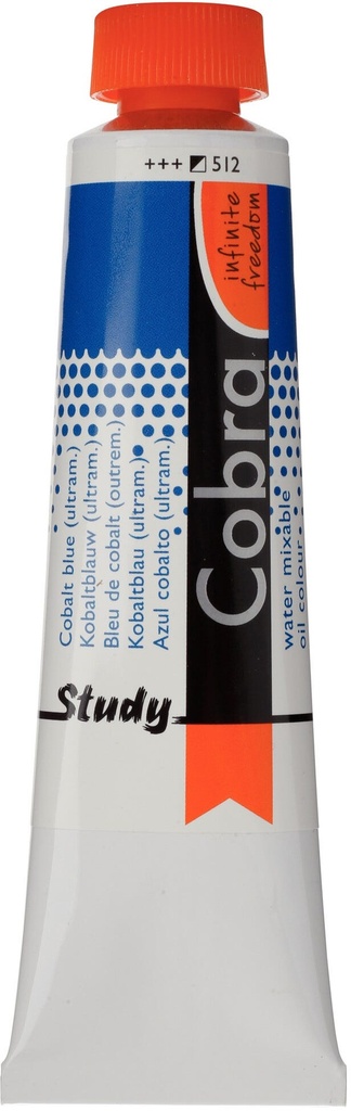 Cobra Study oil colour in Cobalt Blue (Ultramarine) 512 is a semi-opaque colour with excellent lightfastness ( and ).About Cobra StudyCobra Study is a water-mixable oil paint that offers the same fantastic results as traditional oil paints, without having to use harmful solvents.Cobra Study is made with the same high-quality pigments, and yet, with Cobra Study you can paint at an affordable price.This is because we offer only a selected number of colours and use less pigments that are not as finely milled as those used in the Cobra Artist series.Can be mixed and cleaned with water.Created with high-quality pigments.Affordable alternative for the Cobra Artist series.Available in 40 semi-transparent, semi-opaque and opaque colours with the highest degree of lightfastness ( and ).Cobra can be used in conjunction with traditional oils and when mixed at a ratio of Cobra 4:1, the mixture will retain its ability to be thinned and cleaned with water.
