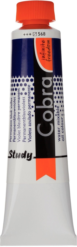 Cobra Study oil colour in Permanent Blue Violet 568 is a semi-transparent colour with excellent lightfastness ( and ).About Cobra StudyCobra Study is a water-mixable oil paint that offers the same fantastic results as traditional oil paints, without having to use harmful solvents.Cobra Study is made with the same high-quality pigments, and yet, with Cobra Study you can paint at an affordable price.This is because we offer only a selected number of colours and use less pigments that are not as finely milled as those used in the Cobra Artist series.Can be mixed and cleaned with water.Created with high-quality pigments.Affordable alternative for the Cobra Artist series.Available in 40 semi-transparent, semi-opaque and opaque colours with the highest degree of lightfastness ( and ).Cobra can be used in conjunction with traditional oils and when mixed at a ratio of Cobra 4:1, the mixture will retain its ability to be thinned and cleaned with water.