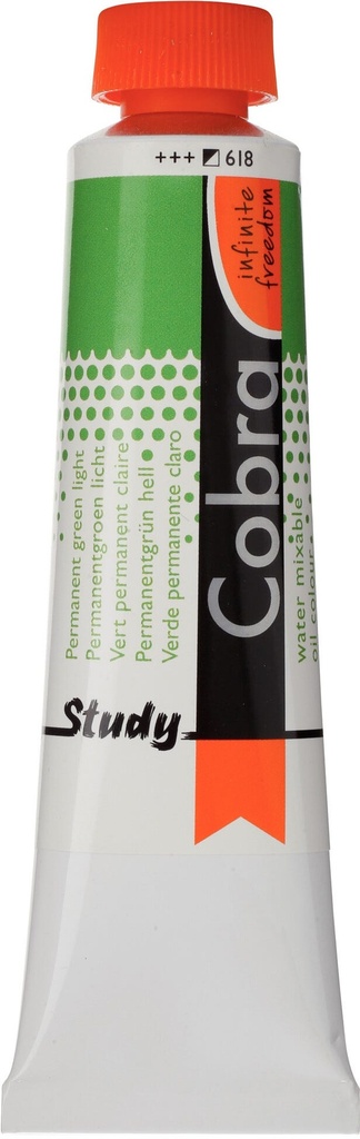 Cobra Study oil colour in Permanent Green Light 618 is a semi-opaque colour with excellent lightfastness ( and ).About Cobra StudyCobra Study is a water-mixable oil paint that offers the same fantastic results as traditional oil paints, without having to use harmful solvents.Cobra Study is made with the same high-quality pigments, and yet, with Cobra Study you can paint at an affordable price.This is because we offer only a selected number of colours and use less pigments that are not as finely milled as those used in the Cobra Artist series.Can be mixed and cleaned with water.Created with high-quality pigments.Affordable alternative for the Cobra Artist series.Available in 40 semi-transparent, semi-opaque and opaque colours with the highest degree of lightfastness ( and ).Cobra can be used in conjunction with traditional oils and when mixed at a ratio of Cobra 4:1, the mixture will retain its ability to be thinned and cleaned with water.