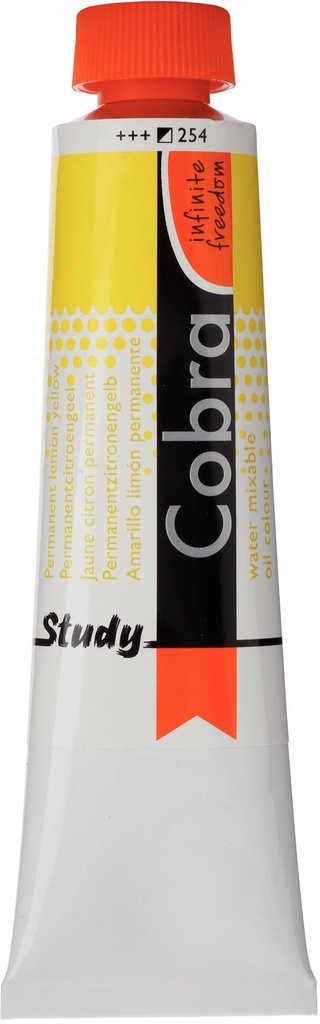 Cobra Study oil colour in Permanent Lemon Yellow 254 is a semi-opaque colour with excellent lightfastness ( and ).About Cobra StudyCobra Study is a water-mixable oil paint that offers the same fantastic results as traditional oil paints, without having to use harmful solvents.Cobra Study is made with the same high-quality pigments, and yet, with Cobra Study you can paint at an affordable price.This is because we offer only a selected number of colours and use less pigments that are not as finely milled as those used in the Cobra Artist series.Can be mixed and cleaned with water.Created with high-quality pigments.Affordable alternative for the Cobra Artist series.Available in 40 semi-transparent, semi-opaque and opaque colours with the highest degree of lightfastness ( and ).Cobra can be used in conjunction with traditional oils and when mixed at a ratio of Cobra 4:1, the mixture will retain its ability to be thinned and cleaned with water.