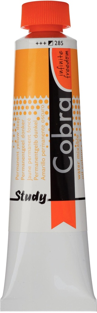 Cobra Study oil colour in Permanent Yellow Deep 285 is a semi-opaque colour with excellent lightfastness ( and ).About Cobra StudyCobra Study is a water-mixable oil paint that offers the same fantastic results as traditional oil paints, without having to use harmful solvents.Cobra Study is made with the same high-quality pigments, and yet, with Cobra Study you can paint at an affordable price.This is because we offer only a selected number of colours and use less pigments that are not as finely milled as those used in the Cobra Artist series.Can be mixed and cleaned with water.Created with high-quality pigments.Affordable alternative for the Cobra Artist series.Available in 40 semi-transparent, semi-opaque and opaque colours with the highest degree of lightfastness ( and ).Cobra can be used in conjunction with traditional oils and when mixed at a ratio of Cobra 4:1, the mixture will retain its ability to be thinned and cleaned with water.