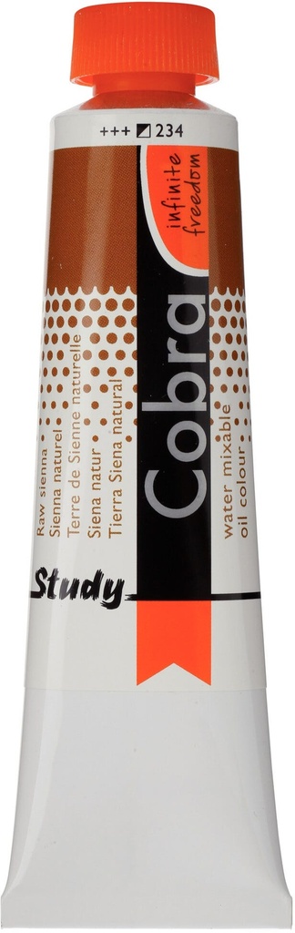 Cobra Study oil colour in Raw Sienna 234 is a semi-opaque colour with excellent lightfastness ( and ).About Cobra StudyCobra Study is a water-mixable oil paint that offers the same fantastic results as traditional oil paints, without having to use harmful solvents.Cobra Study is made with the same high-quality pigments, and yet, with Cobra Study you can paint at an affordable price.This is because we offer only a selected number of colours and use less pigments that are not as finely milled as those used in the Cobra Artist series.Can be mixed and cleaned with water.Created with high-quality pigments.Affordable alternative for the Cobra Artist series.Available in 40 semi-transparent, semi-opaque and opaque colours with the highest degree of lightfastness ( and ).Cobra can be used in conjunction with traditional oils and when mixed at a ratio of Cobra 4:1, the mixture will retain its ability to be thinned and cleaned with water.