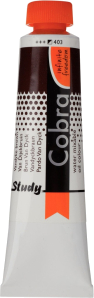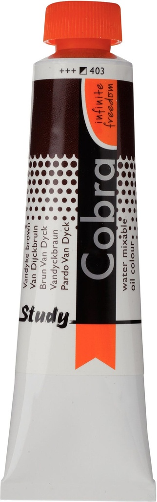 Cobra Study oil colour in Vandyke Brown 403 is a semi-opaque colour with excellent lightfastness ( and ).About Cobra StudyCobra Study is a water-mixable oil paint that offers the same fantastic results as traditional oil paints, without having to use harmful solvents.Cobra Study is made with the same high-quality pigments, and yet, with Cobra Study you can paint at an affordable price.This is because we offer only a selected number of colours and use less pigments that are not as finely milled as those used in the Cobra Artist series.Can be mixed and cleaned with water.Created with high-quality pigments.Affordable alternative for the Cobra Artist series.Available in 40 semi-transparent, semi-opaque and opaque colours with the highest degree of lightfastness ( and ).Cobra can be used in conjunction with traditional oils and when mixed at a ratio of Cobra 4:1, the mixture will retain its ability to be thinned and cleaned with water.