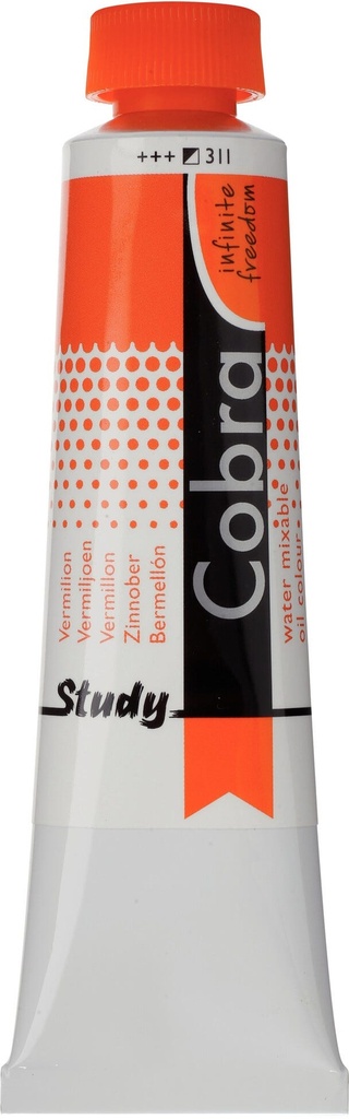 Cobra Study oil colour in Vermilion 311 is a semi-opaque colour with excellent lightfastness ( and ).About Cobra StudyCobra Study is a water-mixable oil paint that offers the same fantastic results as traditional oil paints, without having to use harmful solvents.Cobra Study is made with the same high-quality pigments, and yet, with Cobra Study you can paint at an affordable price.This is because we offer only a selected number of colours and use less pigments that are not as finely milled as those used in the Cobra Artist series.Can be mixed and cleaned with water.Created with high-quality pigments.Affordable alternative for the Cobra Artist series.Available in 40 semi-transparent, semi-opaque and opaque colours with the highest degree of lightfastness ( and ).Cobra can be used in conjunction with traditional oils and when mixed at a ratio of Cobra 4:1, the mixture will retain its ability to be thinned and cleaned with water.