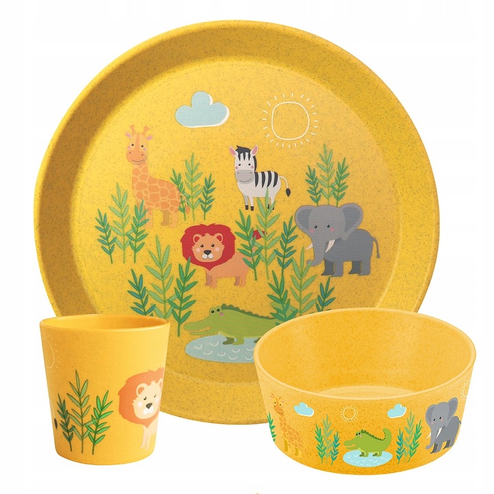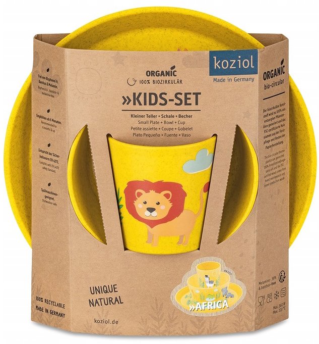 Shatterproof children's lunch set made of safe materials.Want to encourage your child to eat and stay hydrated? Check out the shatterproof Koziol set.Cheerful graphics with an African safari motif and vibrant colors will make your little one more eager to eat.And you'll be sure you're choosing the best for your child, as the innovative material used to make the container is completely safe!